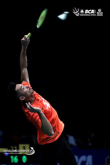 Lin Dan (Tiongkok) melepaskan smash
