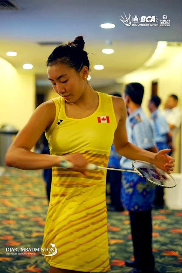 Michelle Li (Kanada) melakukan pemanasan sebelum bertanding