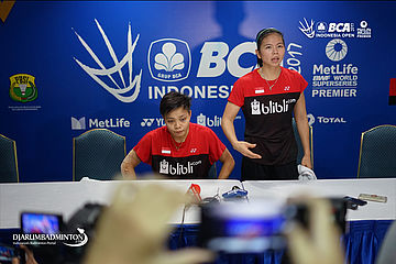 Greysia Polii dan Apriani Rahayu (Indonesia) saat menjawab pertanyaan wartawan