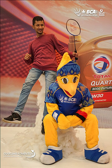 Seorang pengunjung foto bersama maskot BIO di booth Total