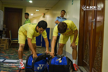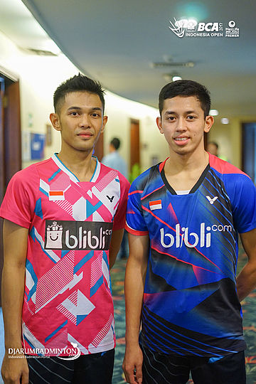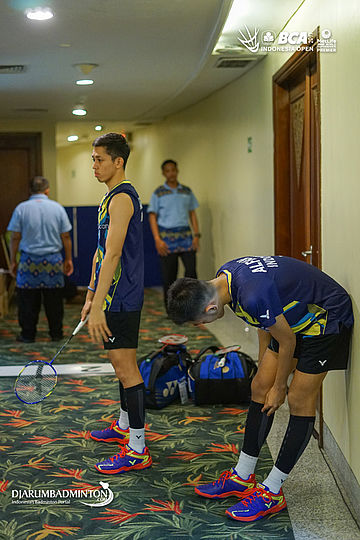 Fajar Alfian dan Muhammad Rian Ardianto (Indonesia) bersiap memasuki lapangan pertandingan