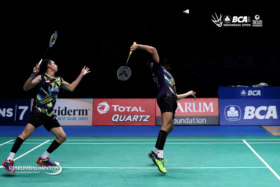 Fajar Alfian/Muhammad Rian Ardianto (Indonesia) bersiap menyambar pengembalian