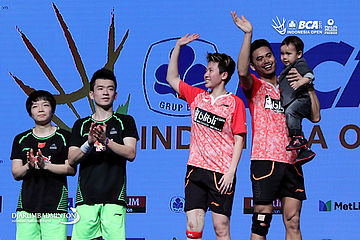 Runner up Zheng Siwei/Chen Qingchen (Tiongkok) dan juara ganda putra BCA Indonesia Open Superseries Premier 2017, Tontowi Ahmad/Liliyana Natsir (Indonesia) berfoto bersama di podium.