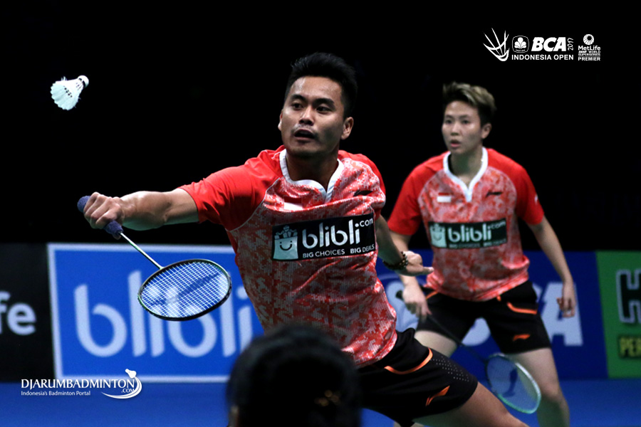 Tontowi Ahmad/Liliyana Natsir (Indonesia) saling berkoordinasi di lapangan