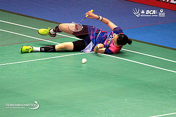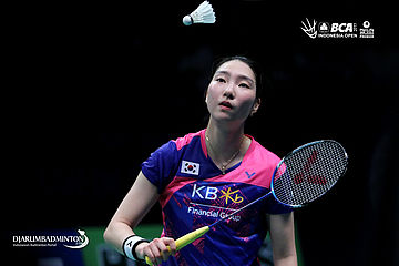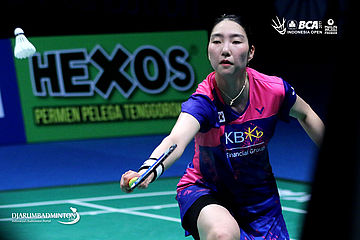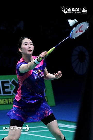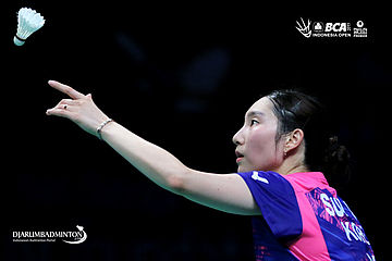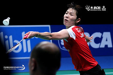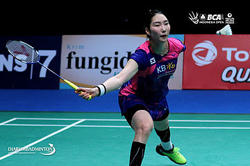 Sung Ji Hyun (Korea) mengembalikan shuttlecock