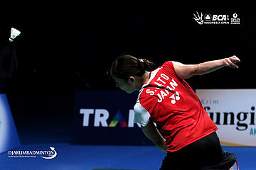 Sayaka Sato (Jepang) mengembalikan shuttlecock