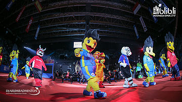 Para maskot menampilkan hiburan saat pembukaan semifinal BLIBLI Indonesia Open 2018