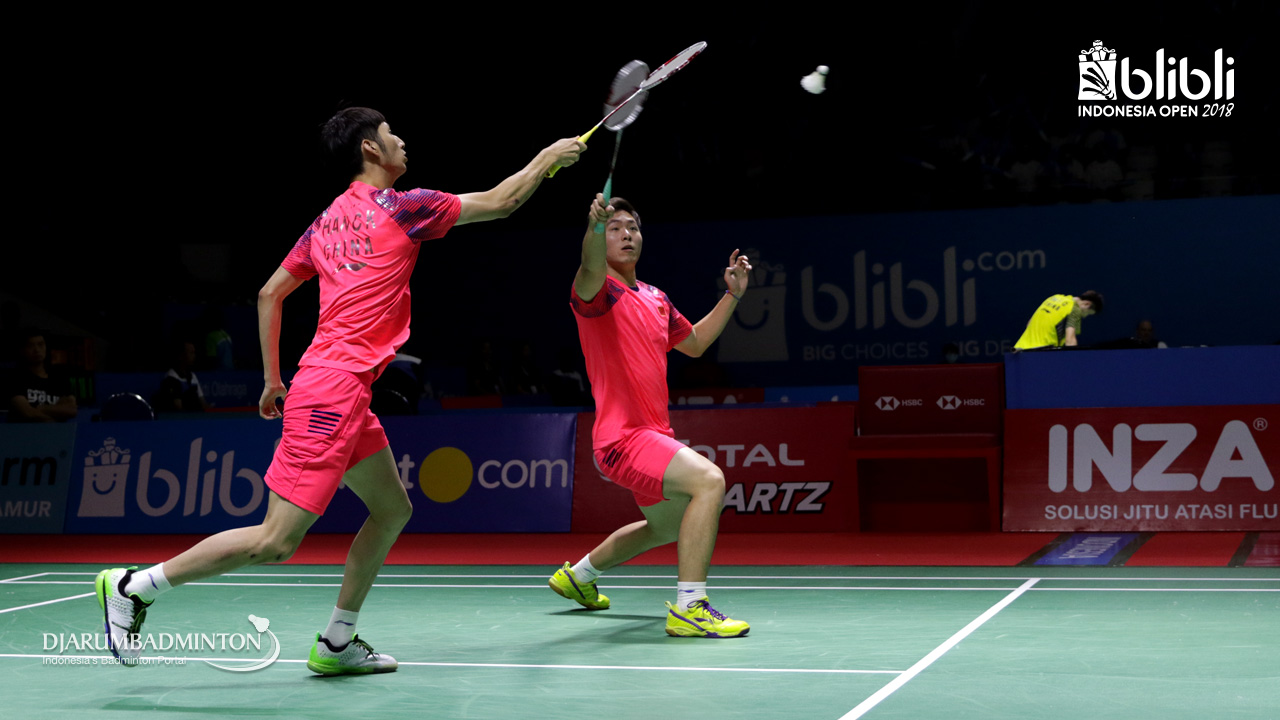 Berry Angriawan/Hardianto (INA) bersiap menghadang pengembalian.