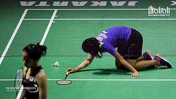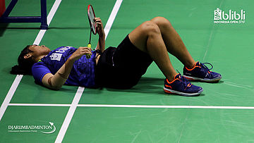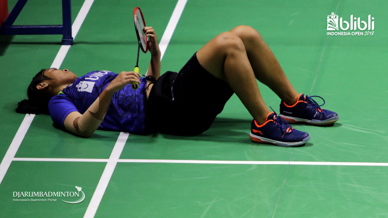 Gregoria Mariska Tunjung (INA) terjatuh saat berusaha menggapai pengembalian.