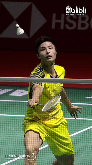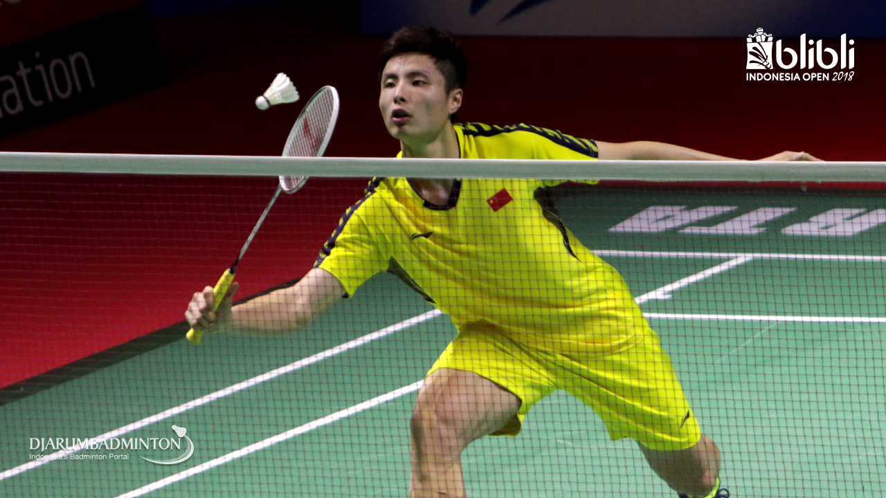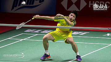 Shi Yuqi (CHN) mengembalikan shuttlecock.