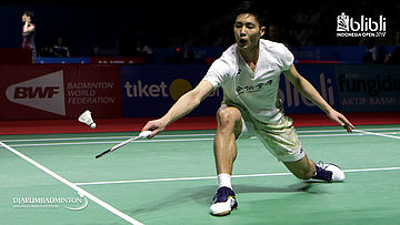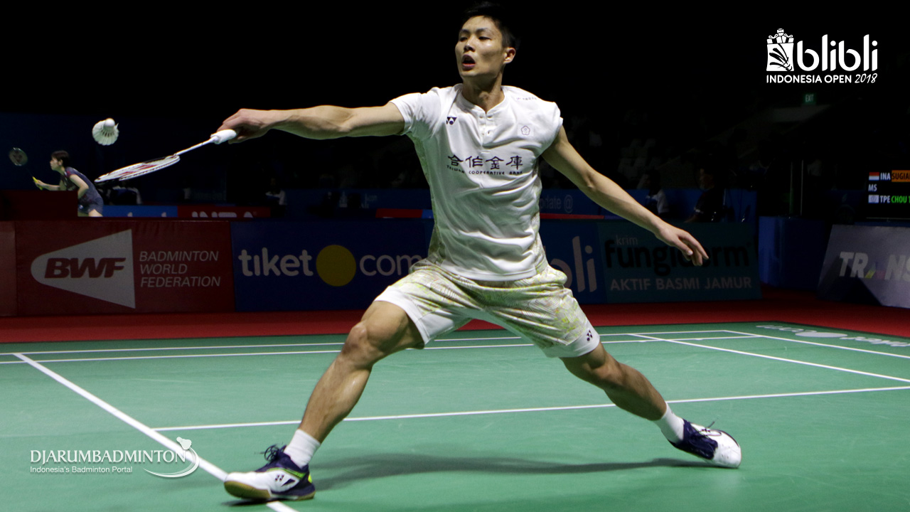 Chou Tien Chen (TPE) mengembalikan shuttlecock.