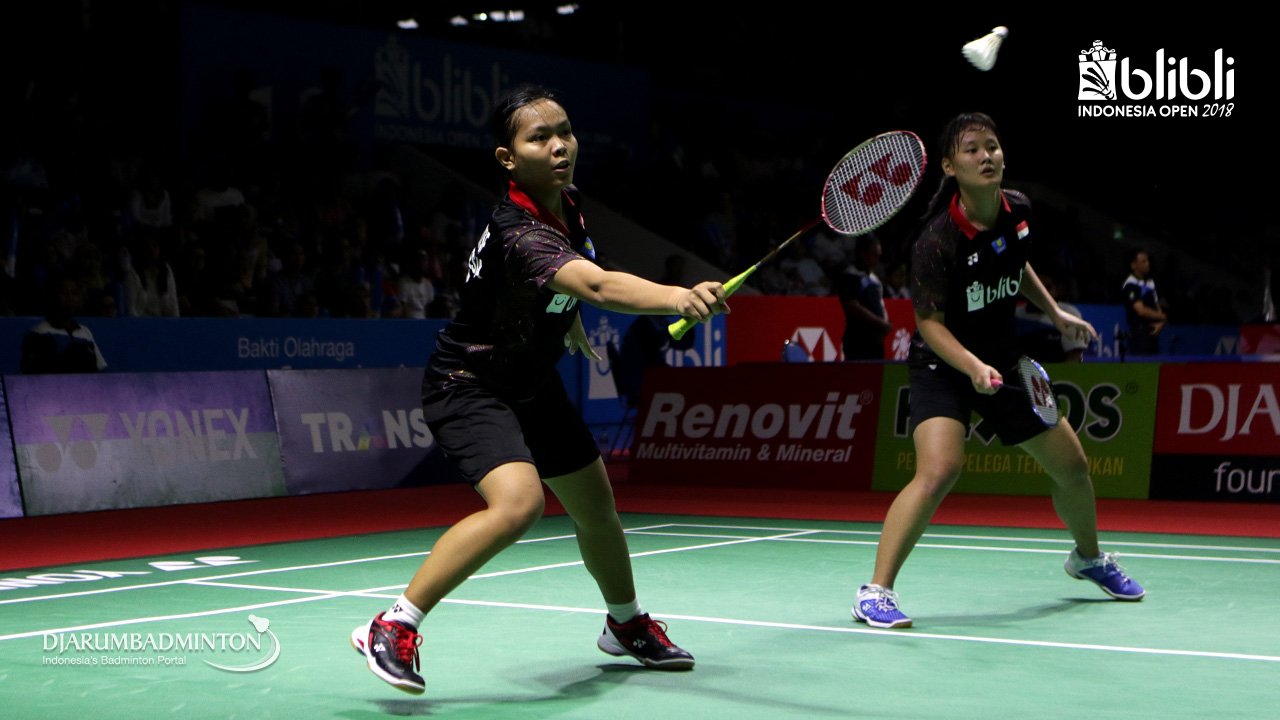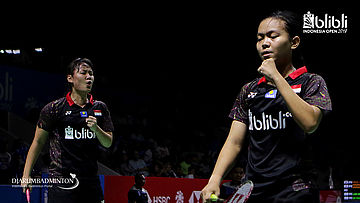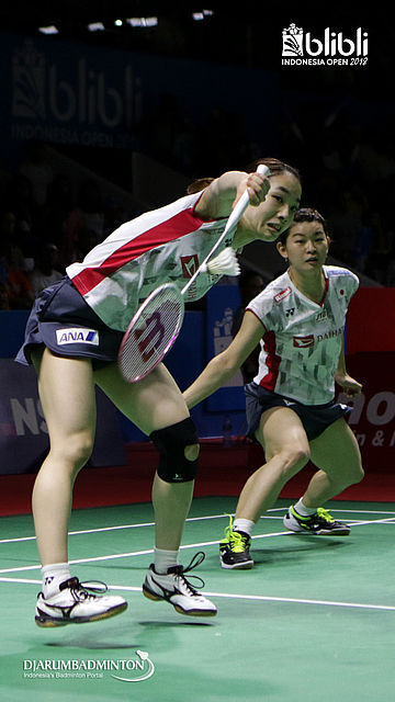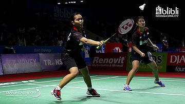 Misaki Matsutomo/Ayaka Takahashi (JPN) menghadang serangan.