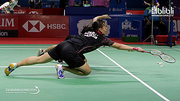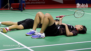 Agatha Imanuela/Siti Fadia Silva Ramadhanti (INA) terjatuh saat berusaha menggapai pengembalian.