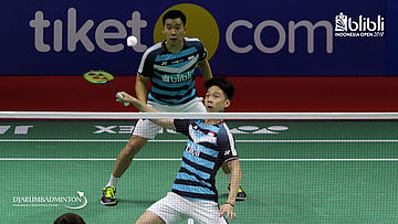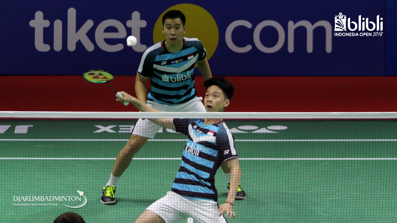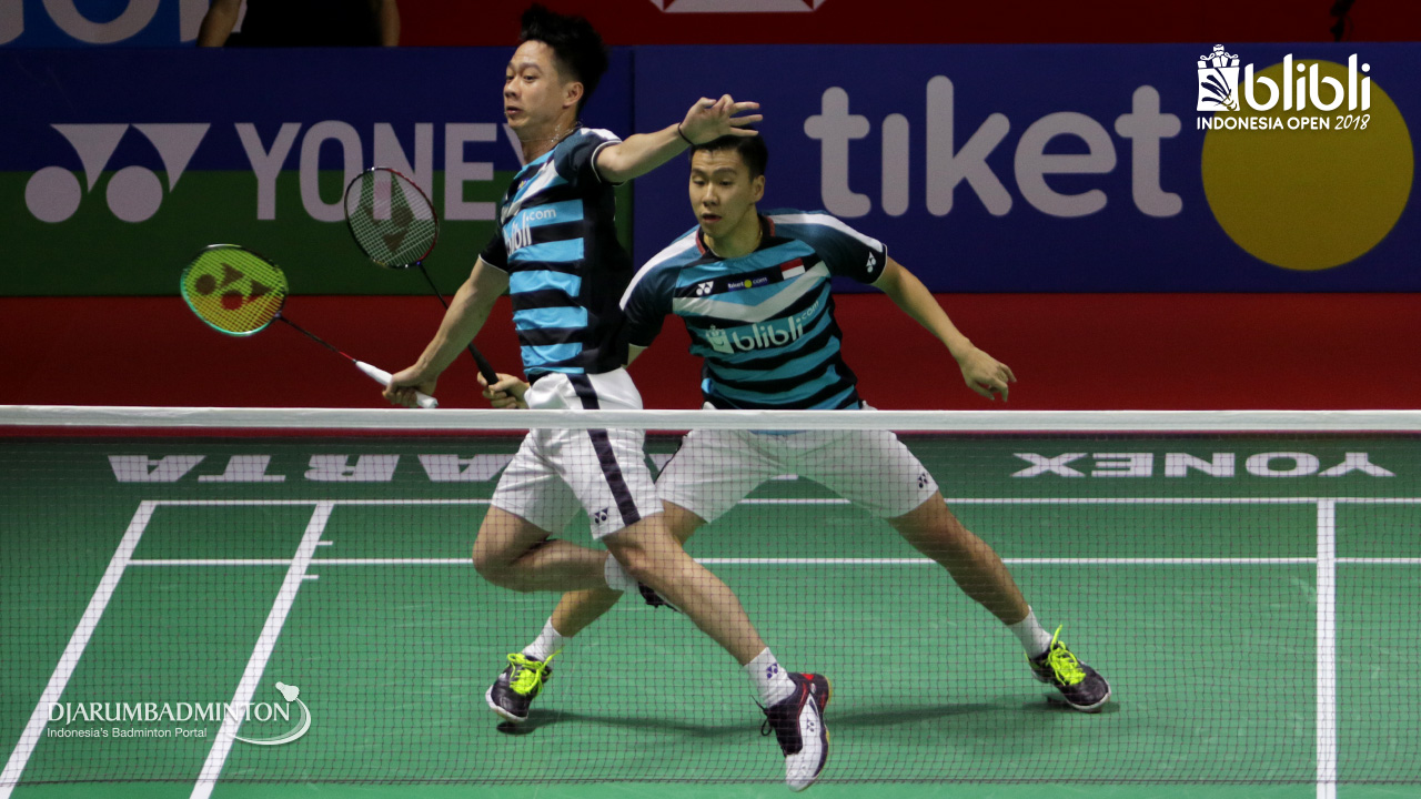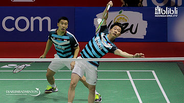 Marcus Fernaldi Gideon/Kevin Sanjaya Sukamuljo (INA) menyambar pengembalian tanggung.