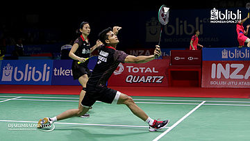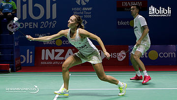 Chris Adcock/Gabrielle Adcock (ENG) mengembalikan shuttlecock.