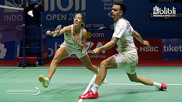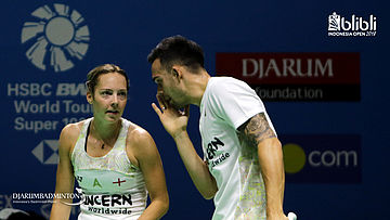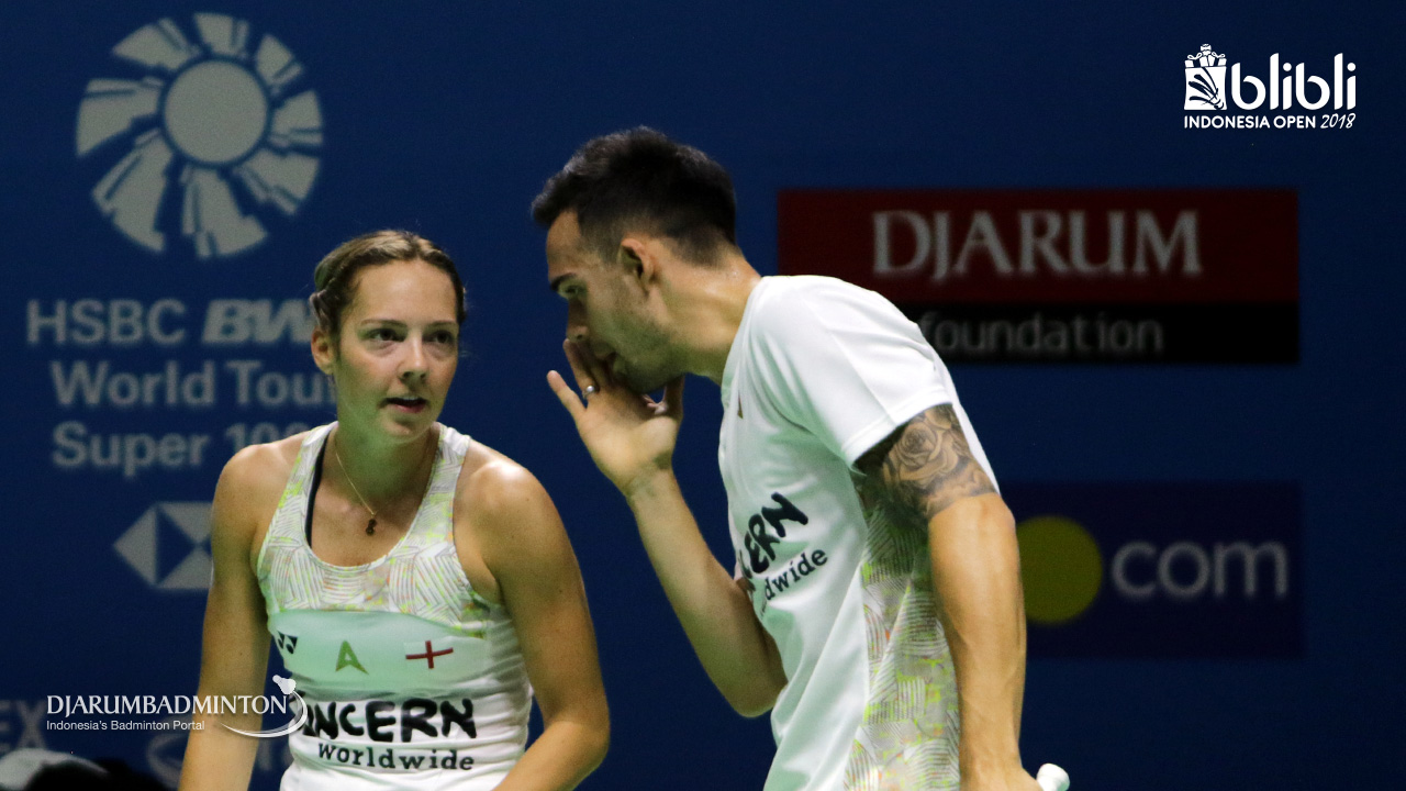 Chris Adcock/Gabrielle Adcock (ENG) saling berkoordinasi di lapangan.