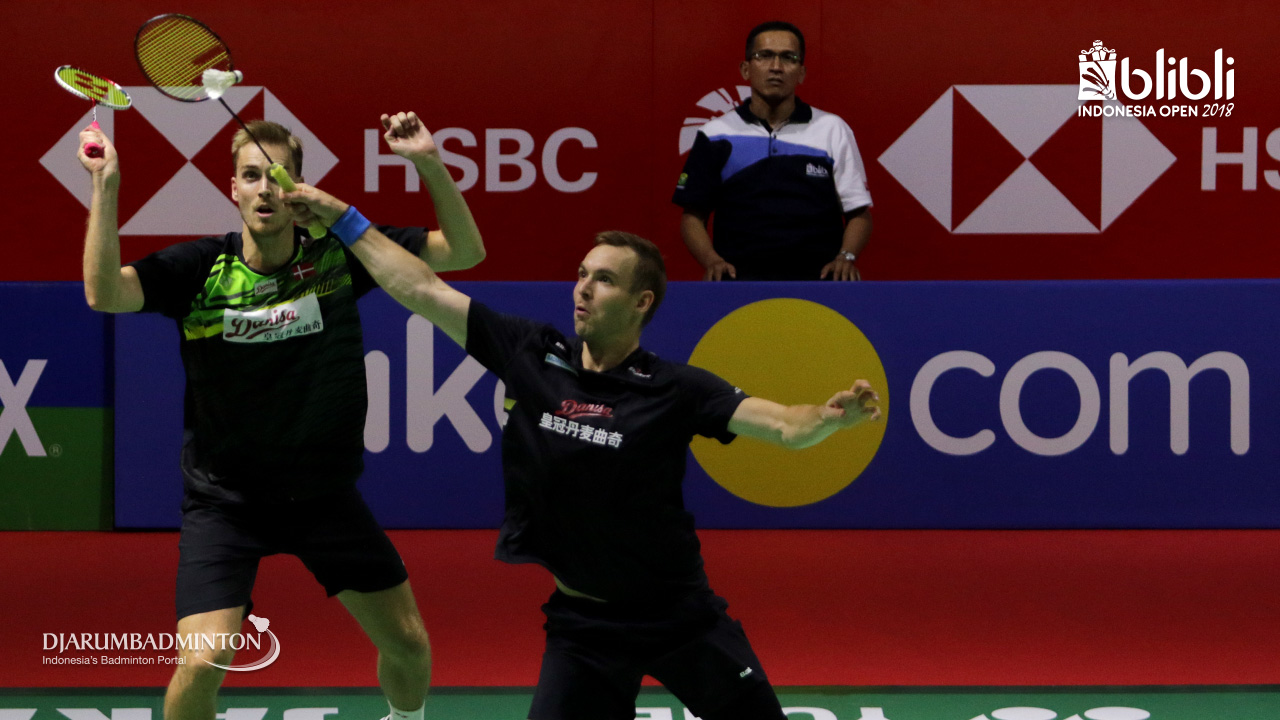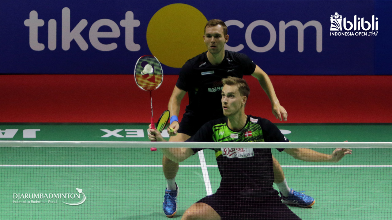 Mads Conrad-Petersen/Mads Pieler Kolding (DEN) mengembalikan shuttlecock.