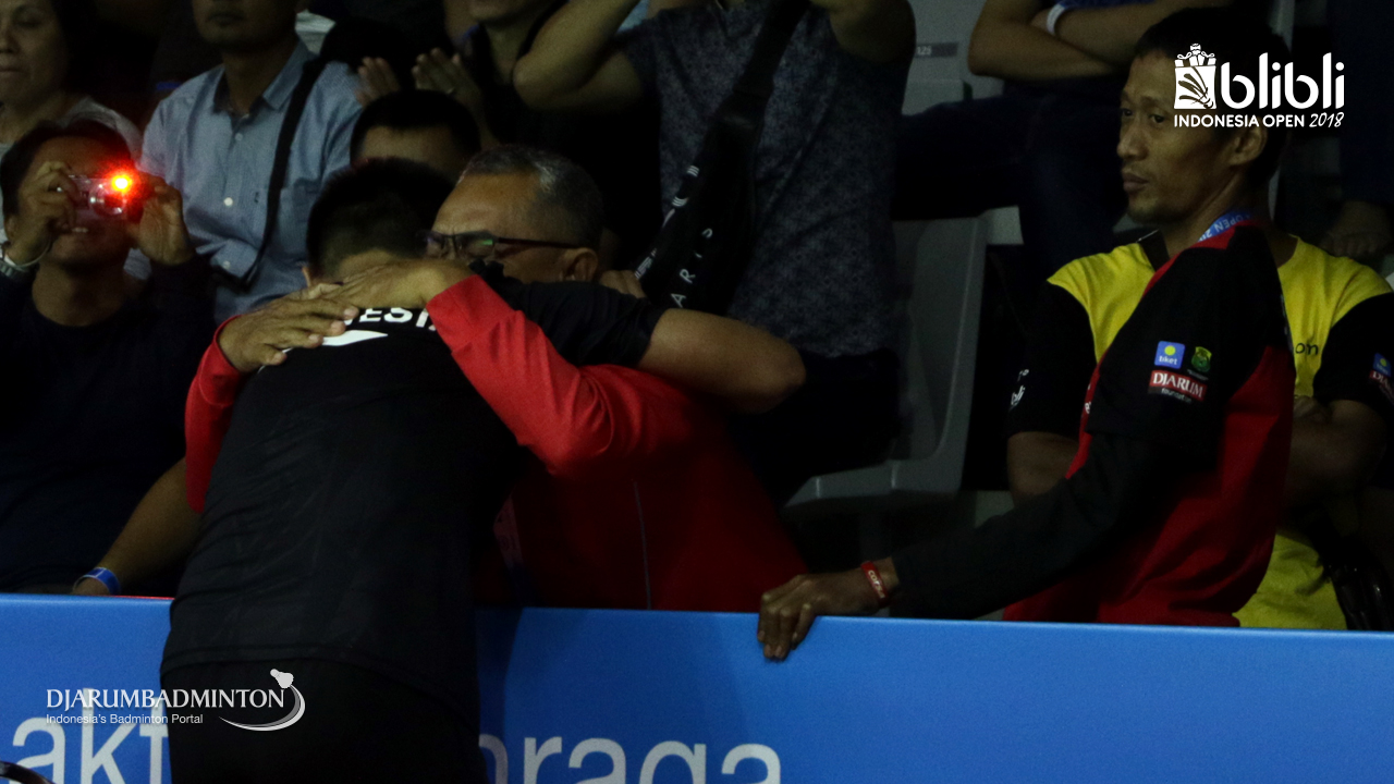 Hafiz Faizal (INA) memeluk ayahnya usai memenangkan pertandingan.