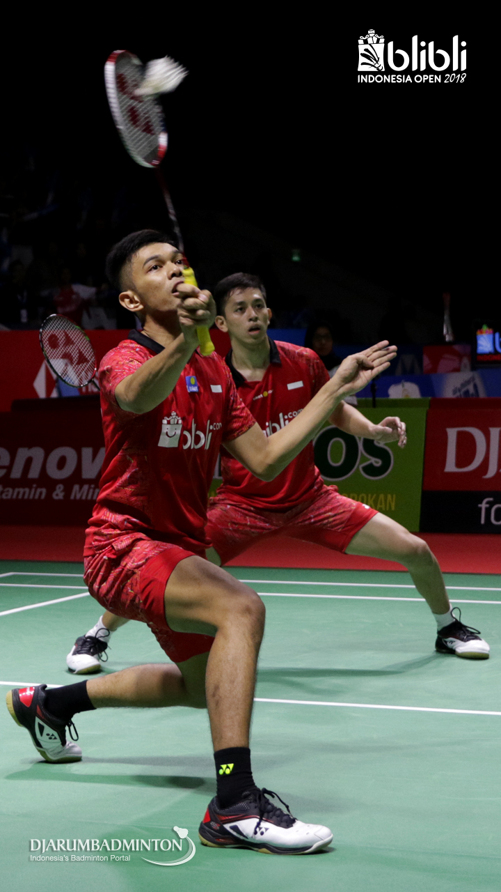 Fajar Alfian/Muhammad Rian Ardianto (INA) mengembalikan shuttlecock.