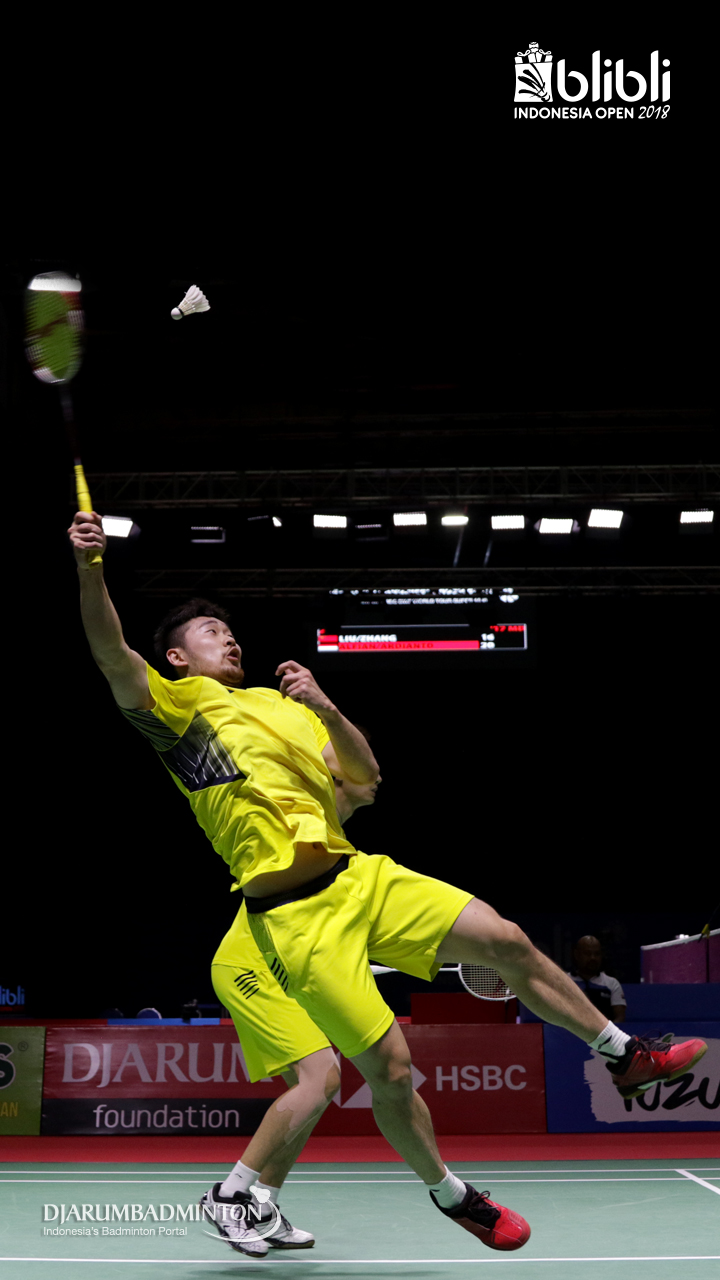 Liu Cheng/Zhang Nan (CHN) menyambar pengembalian.