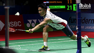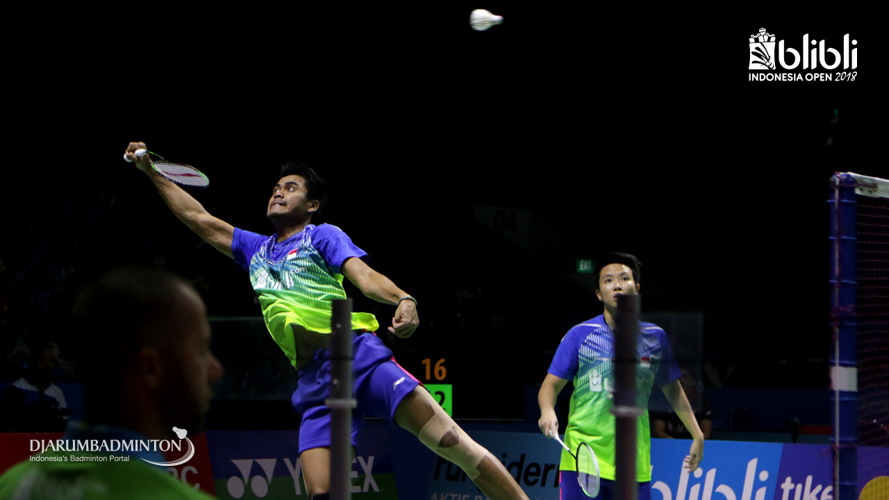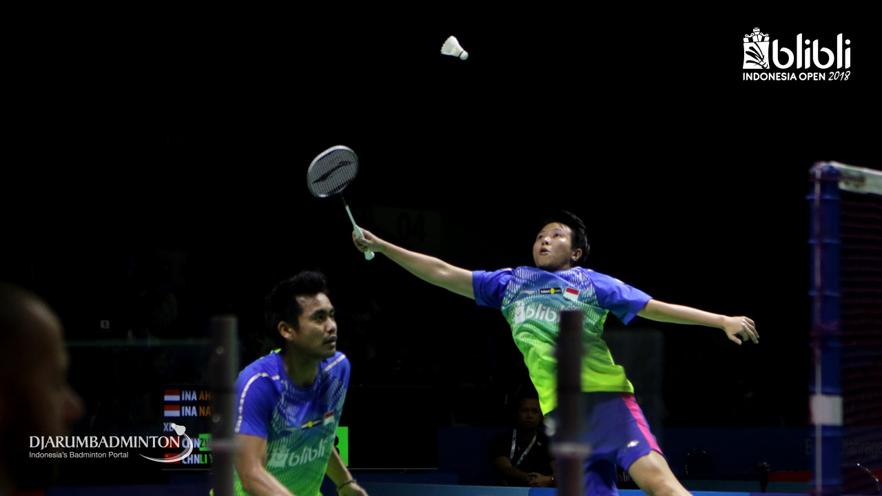 Marcus Fernaldi Gideon/Kevin Sanjaya Sukamuljo (INA) menghadang serangan.