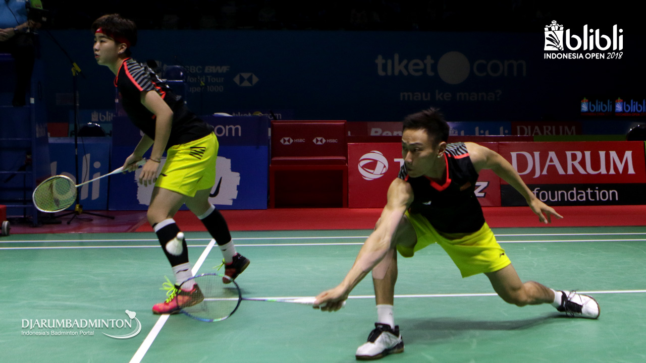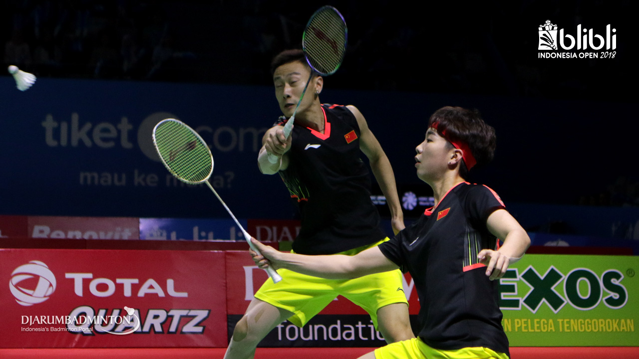 Zhang Nan/Li Yinhui (CHN) bersiap menghadang serangan.