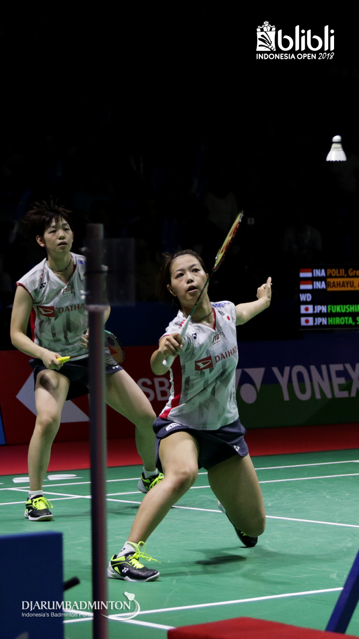 Yuki Fukushima/Sayaka Hirota (JPN) mengembalikan shuttlecock.