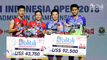 Chan Peng Soon/Goh Liu Ying (MAS) dan Tontowi Ahmad/Liliyana Natsir (INA) berfoto bersama di atas podium.