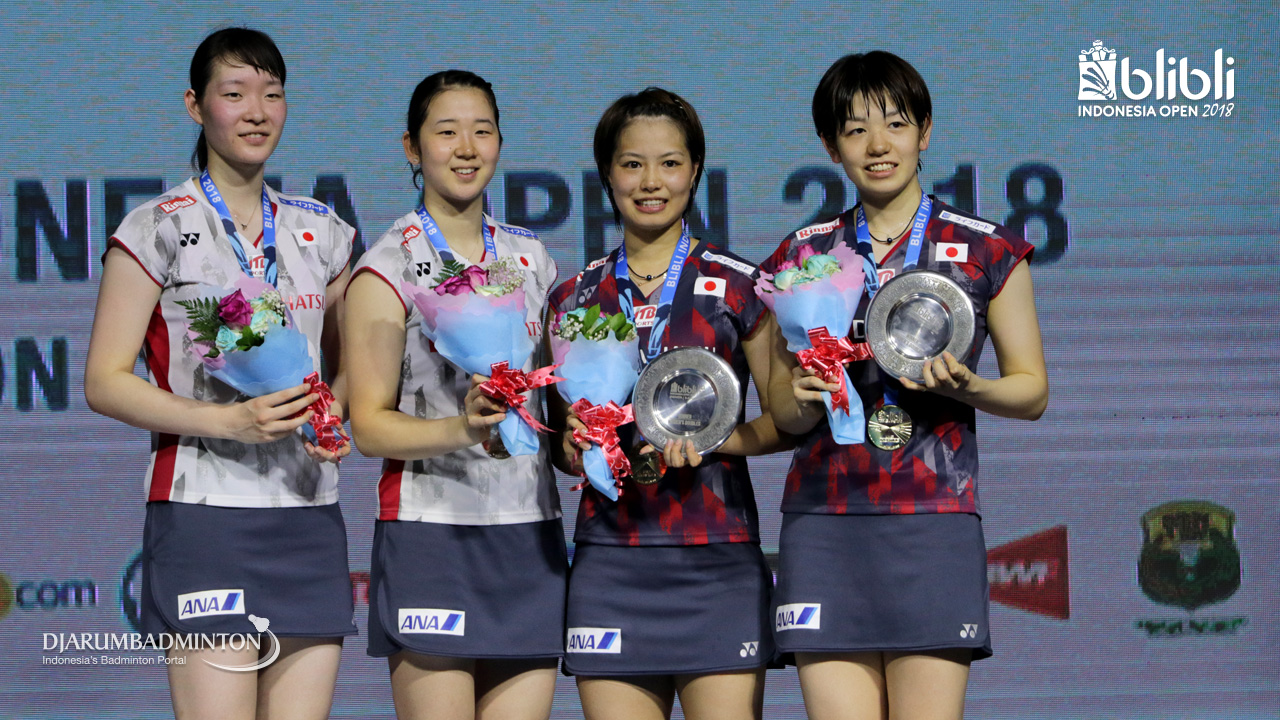 Mayu Matsumoto/Wakana Nagahara (JPN) dan Yuki Fukushima/Sayaka Hirota (JPN) berfoto bersama di atas podium