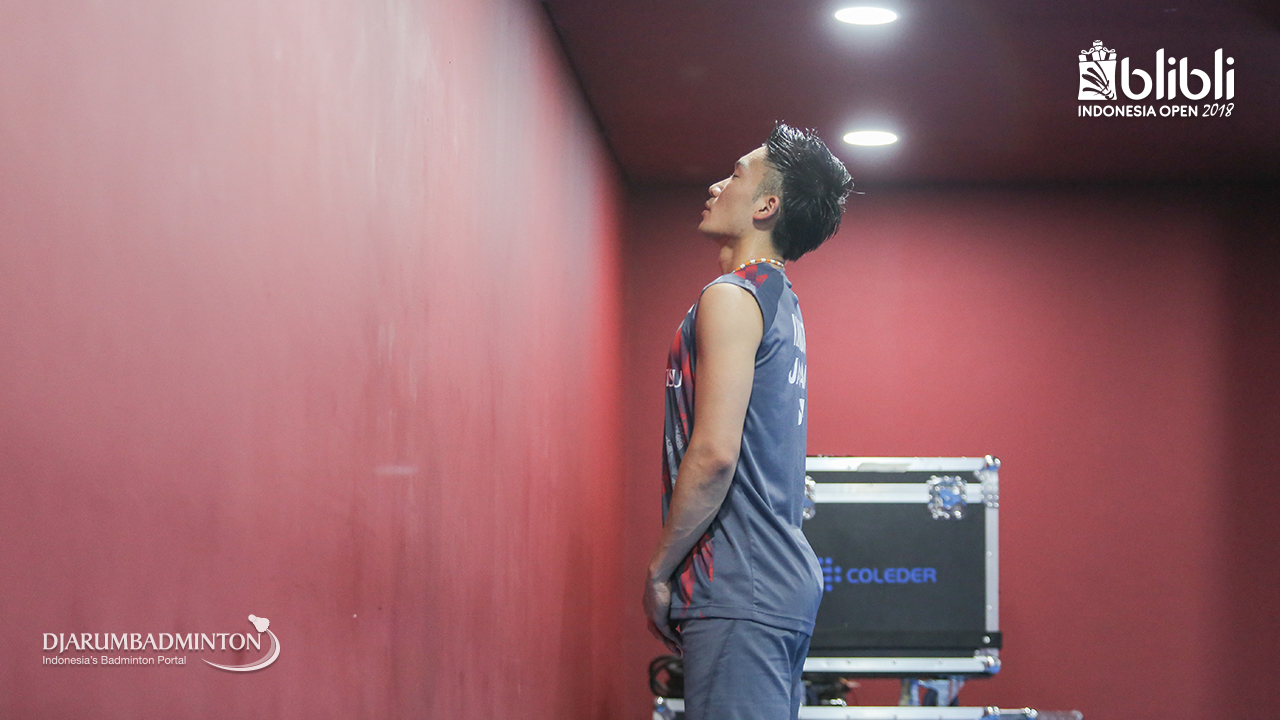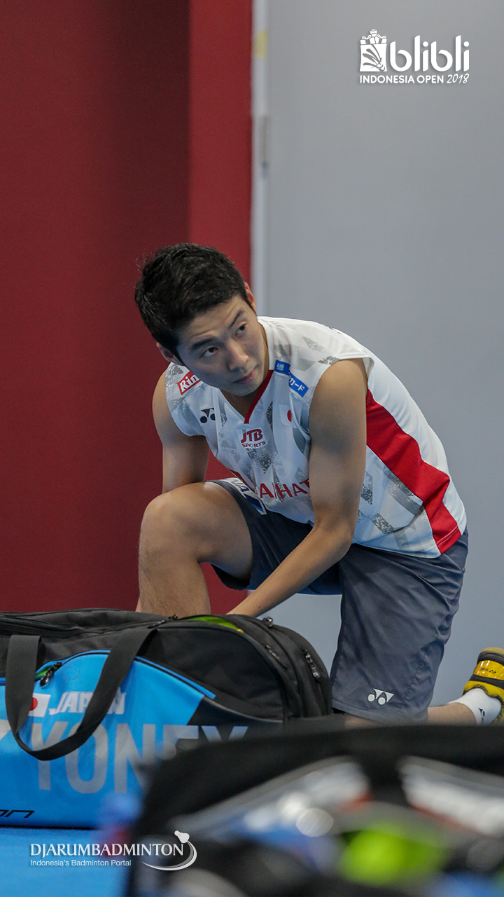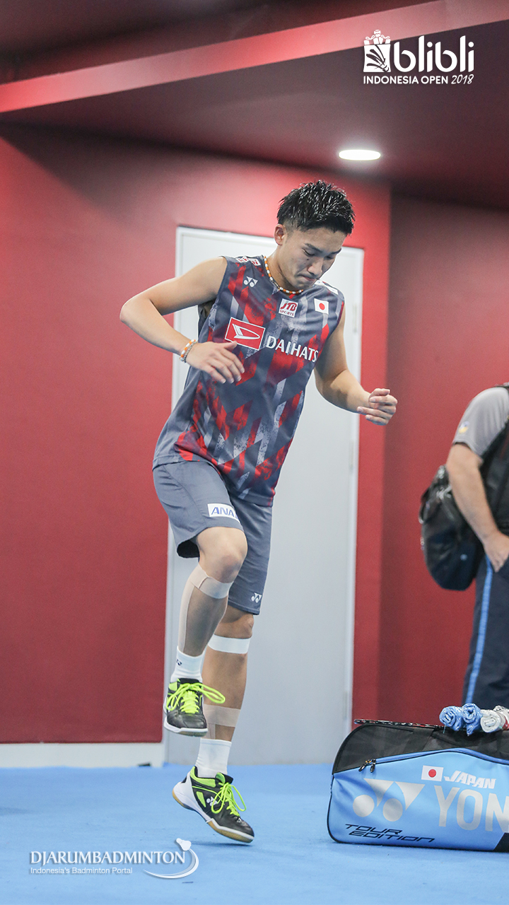 Kento MOMOTA (Jepang) saat melakukan pemanasan