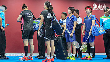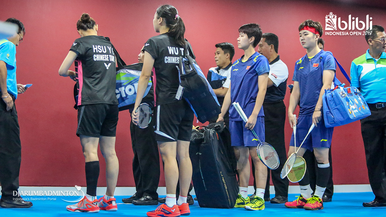 Pasangan HSU Ya Ching, WU Ti Jung (Taipei) dan DU Yue, LI Yinhui (Tiongkok) bersiap memasuki lapangan pertandingan