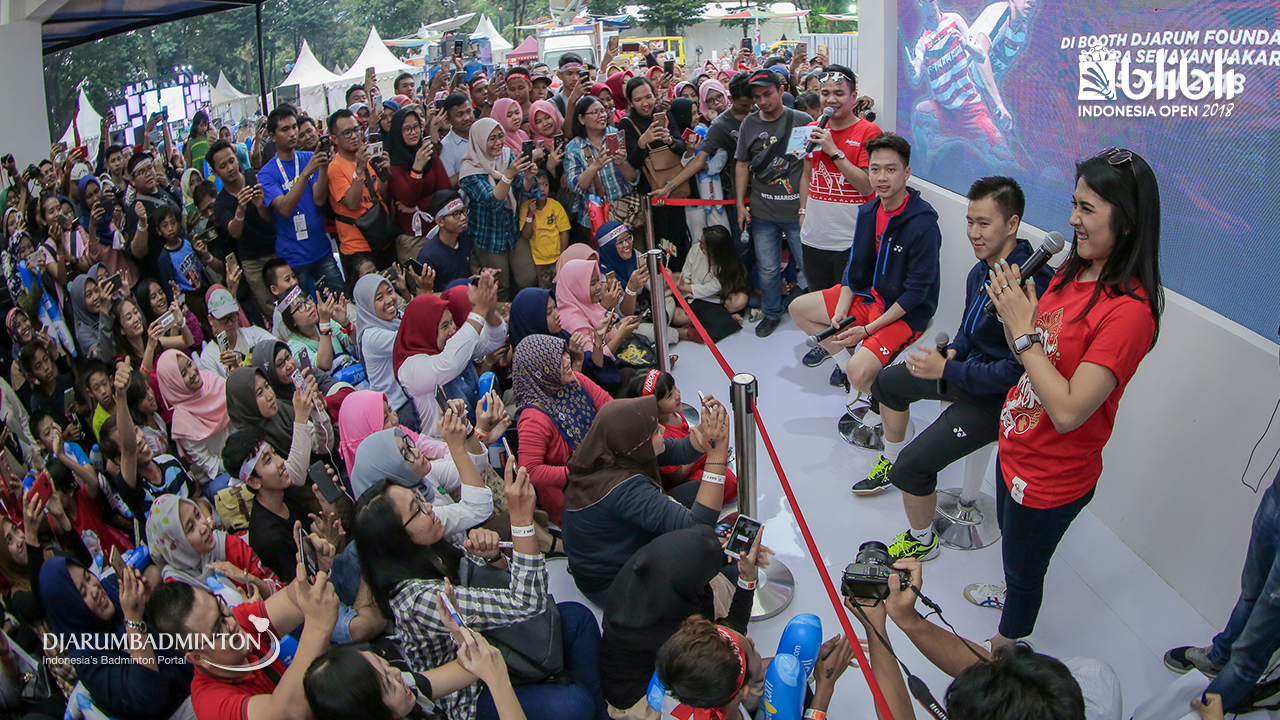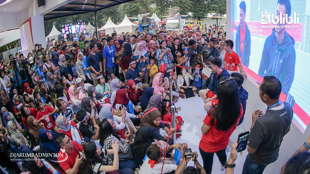 Suasana meet and greet Gregoria Mariska TUNJUNG dan Anthony Sinisuka GINTING (Indonesia) di booth BLIBLI