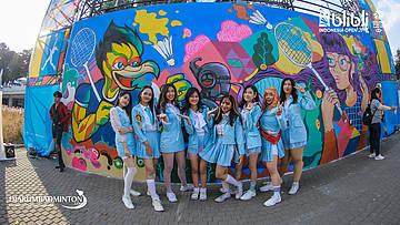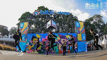 Salah seorang sedang membuat mural di area Blibli Indonesia Open 2019