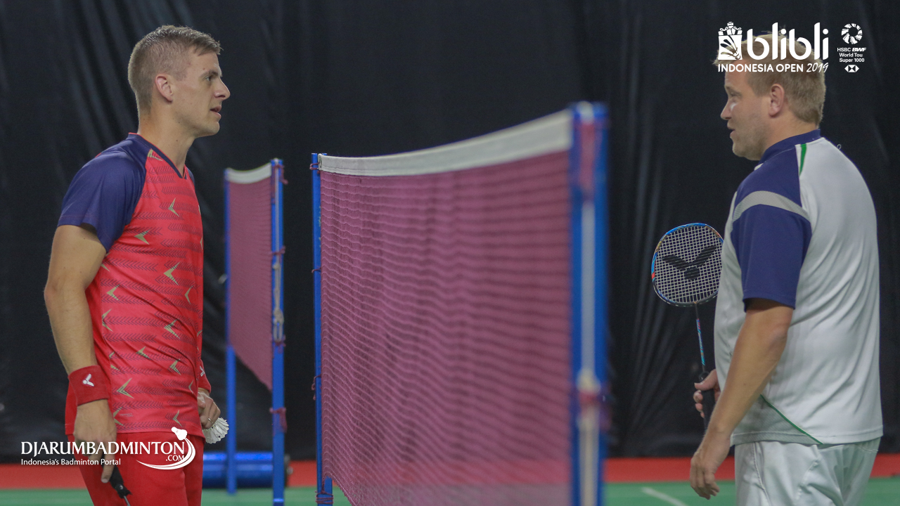 Hans-Kristian Solberg Vittinghus (DEN) melakukan pemanasan di Warming Up Hall