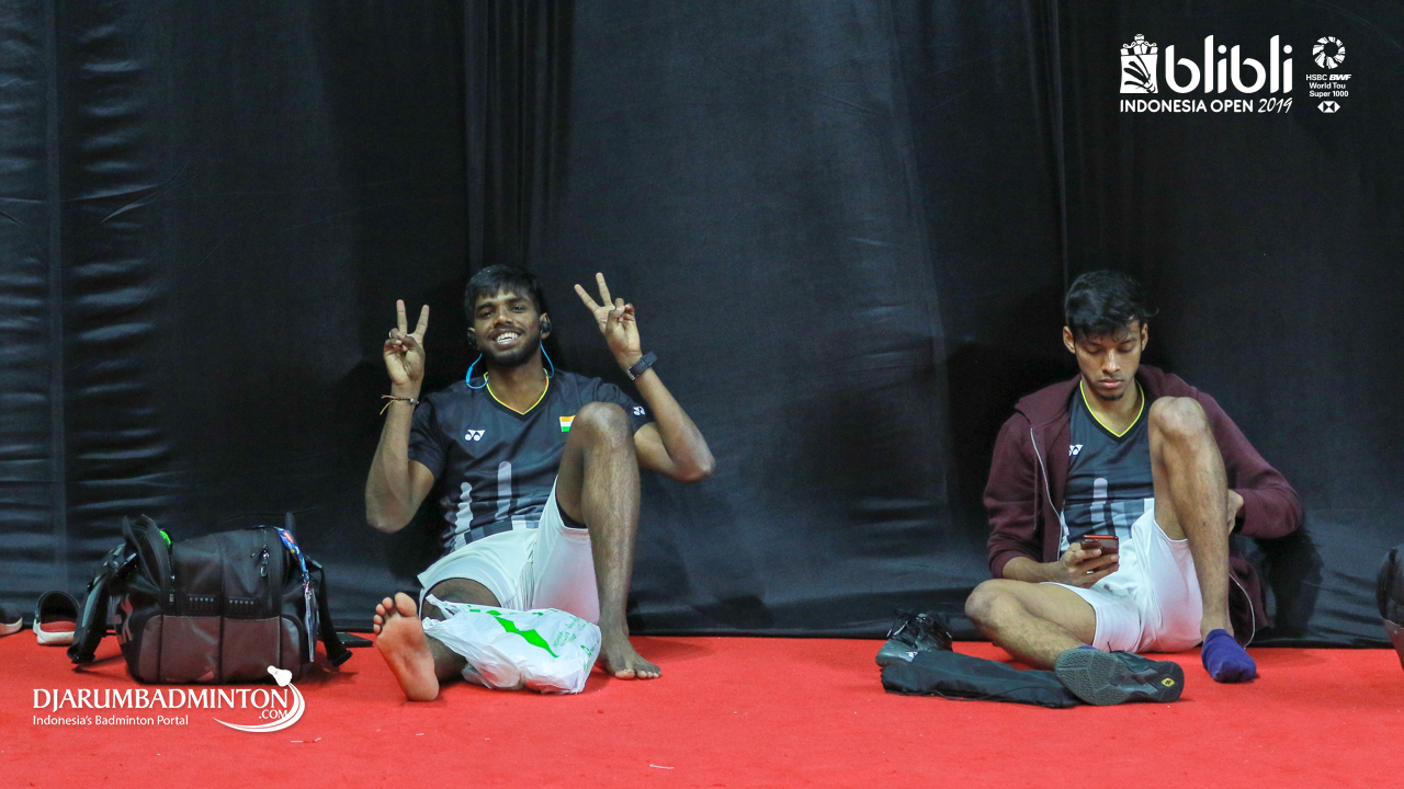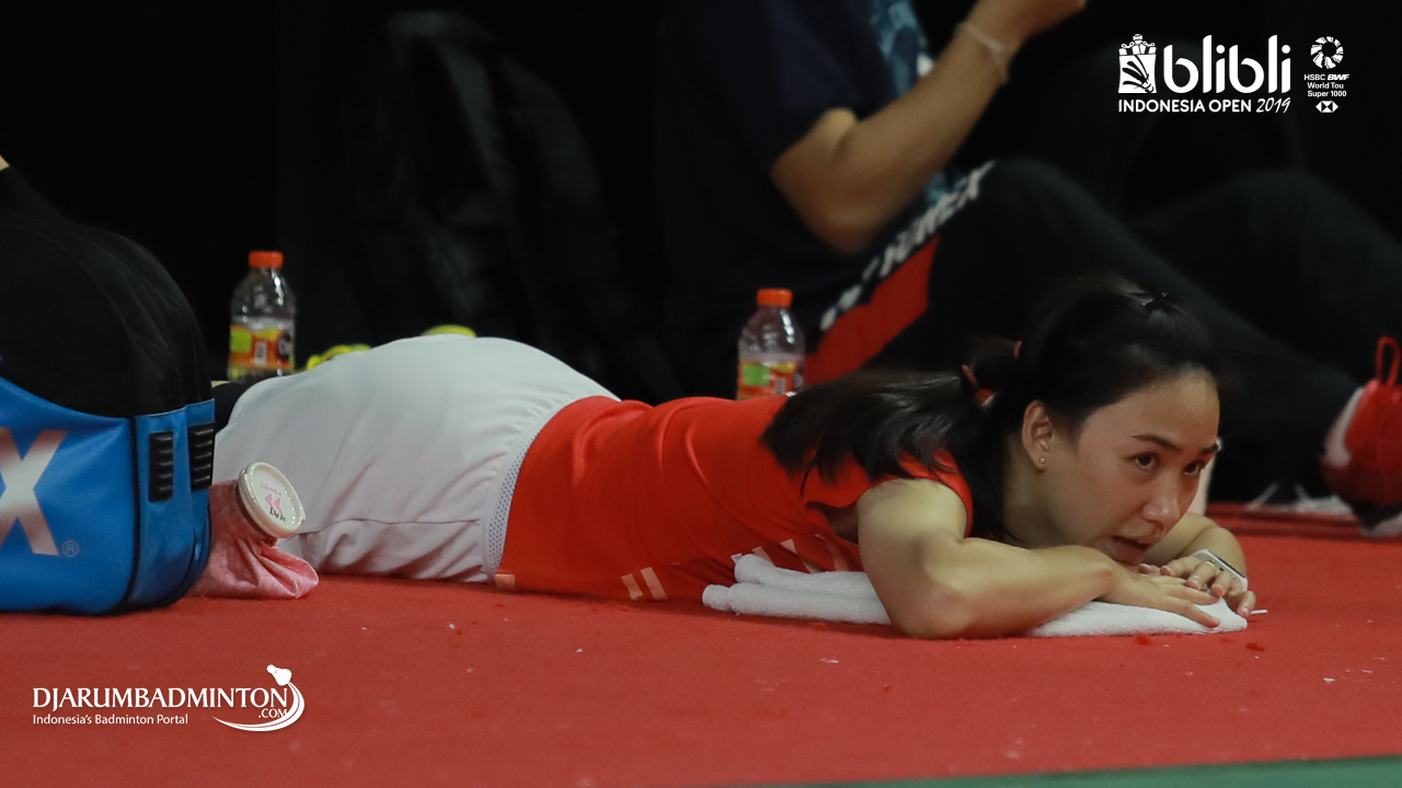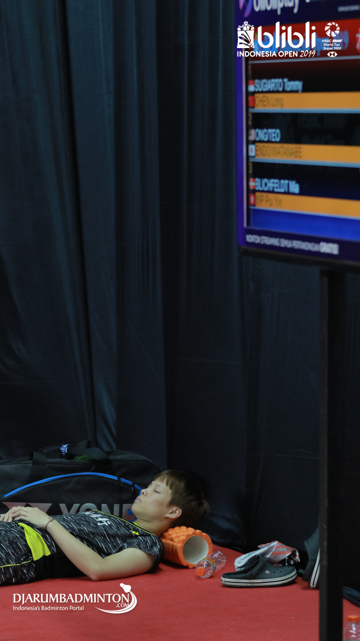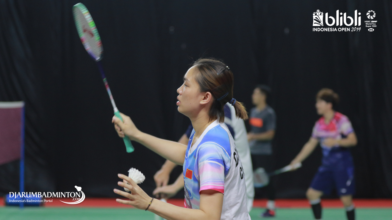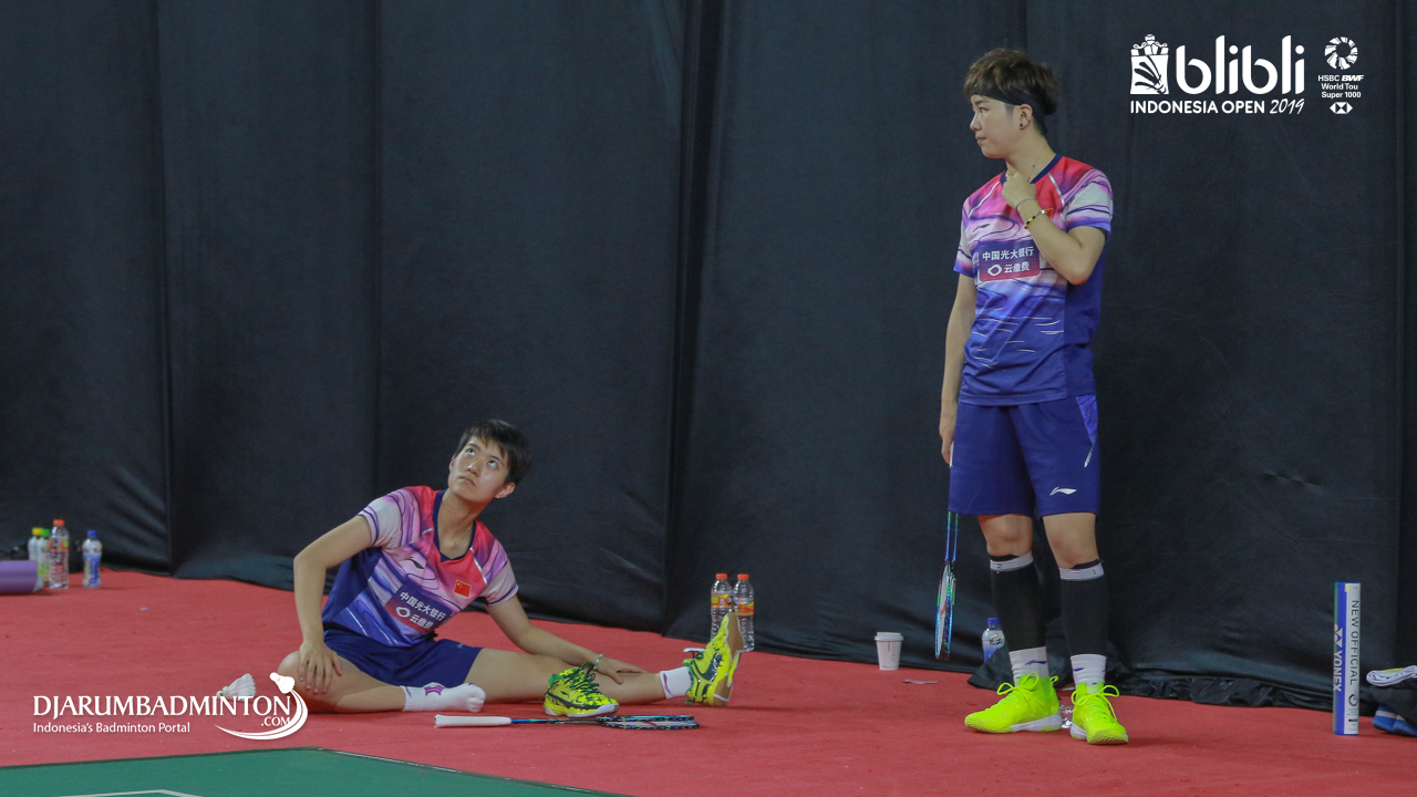 Jia Yi Fan (kiri) dan Chen Qing Chen (CHN) melakukan pemanasan di Warming Up Hall