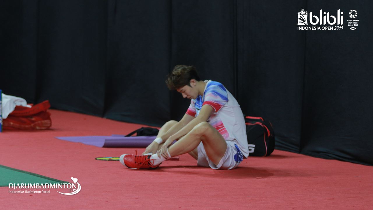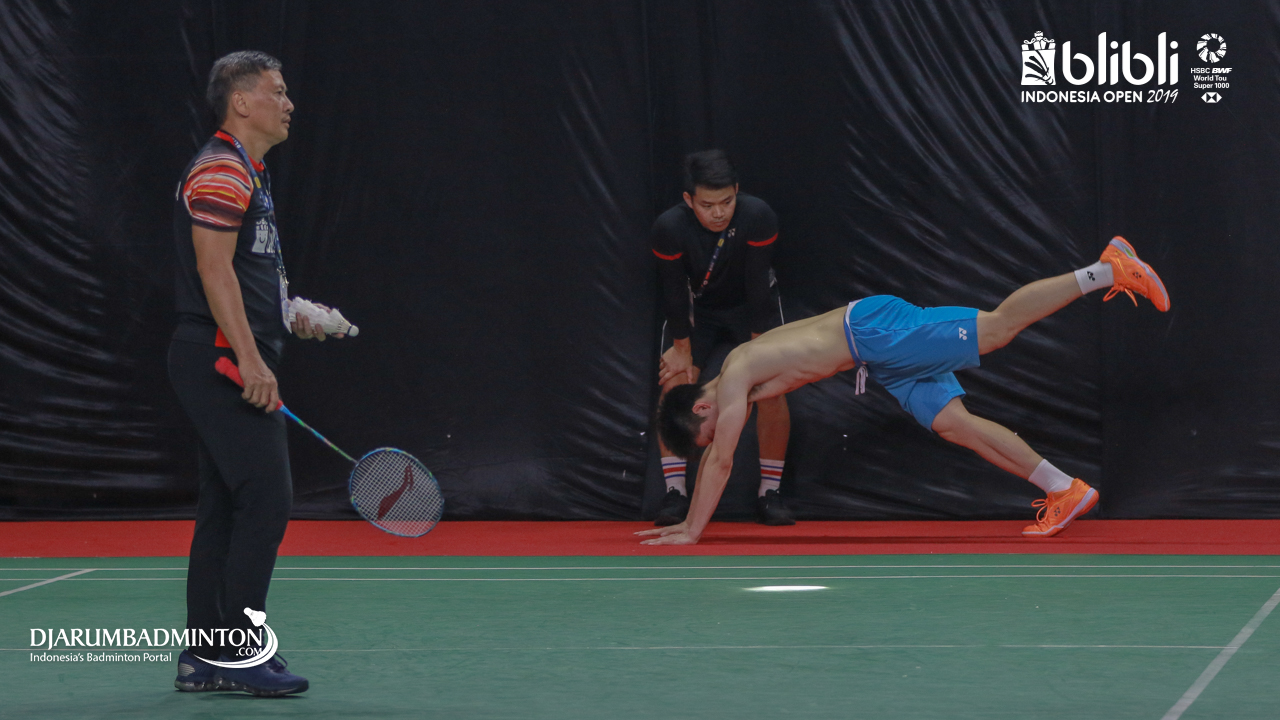 Jonatan Christie melakukan pemanasan di Warming Up Hall