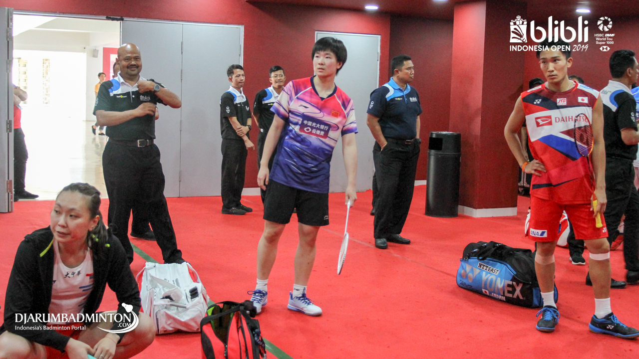 Jia Yi Fan (kiri) dan Chen Qing Chen melakukan pemanasan di player services