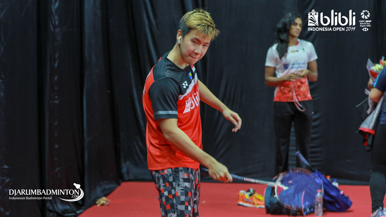 Hendra Setiawan melakukan pemanasan di Warming Up Hall