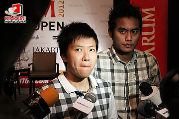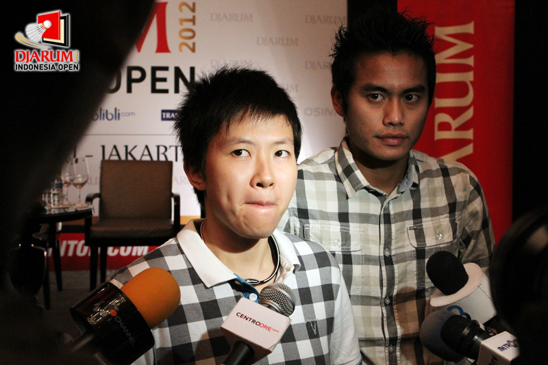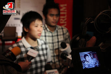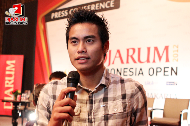 Pemain Indonesia Tontowi Ahmad diwawancarai oleh wartawan di konfrensi pers Djarum Indonesia Open 2012 di Bali Room di Hotel Kempinski, Jakarta.