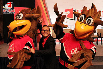 Stenny Agustaf bersenda gurau dengan maskot Djarum Indonesia Open 2012, Stenny Agustaf saat konfrensi pers Djarum Indonesia Open 2012 di Bali Room di Hotel Kempinski, Jakarta.
