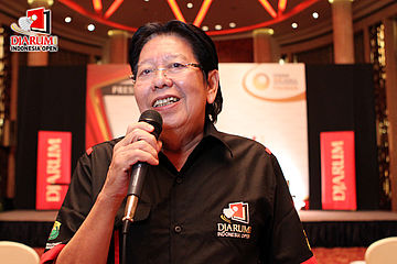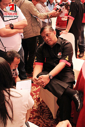 Ketua Umum PB PBSI Djoko Santoso diwawancarai oleh wartawan di konfrensi pers Djarum Indonesia Open 2012 di Bali Room di Hotel Kempinski, Jakarta.