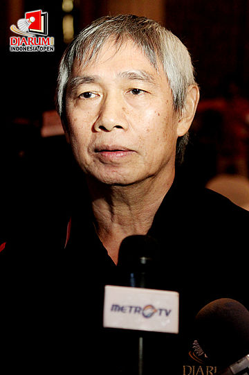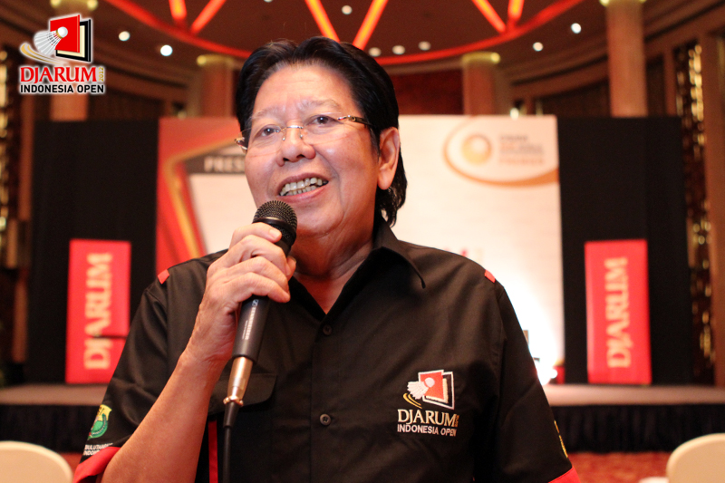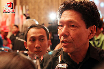 Kepala Sub bidang Pelatnas PB PBSI Christian Hadinata diwawancarai oleh wartawan di konfrensi pers Djarum Indonesia Open 2012 di Bali Room di Hotel Kempinski, Jakarta.