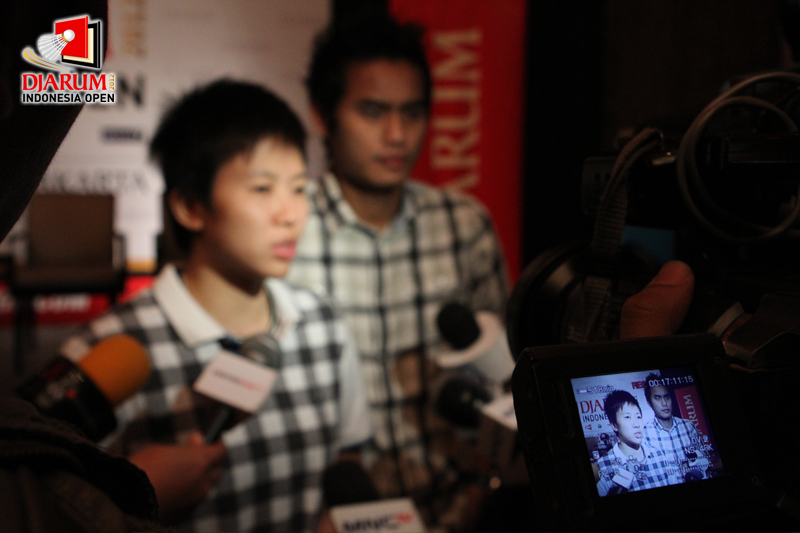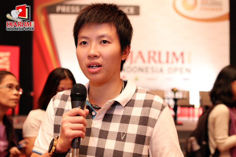 Pemain Indonesia Lilyana Natsir diwawancarai oleh wartawan di konfrensi pers Djarum Indonesia Open 2012 di Bali Room di Hotel Kempinski, Jakarta.