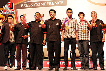 Pengurus PB PBSI, atlet, pelatih, serta pihak sponsor yang hadir dalam saat konfrensi pers Djarum Indonesia Open 2012 di Bali Room di Hotel Kempinski, Jakarta.