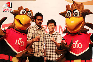 (Kanan-kiri) Lilyana Natsir, Tontowi Ahmad, Yacob Rusdianto, Djoko Santoso, Yan Haryadi, berpose bersama maskot DIO saat konfrensi pers Djarum Indonesia Open 2012 di Bali Room di Hotel Kempinski, Jakarta.