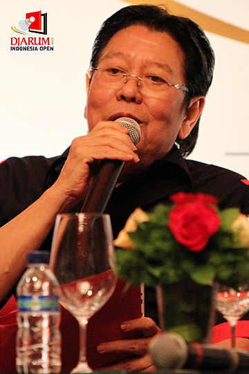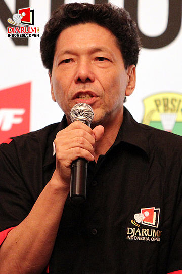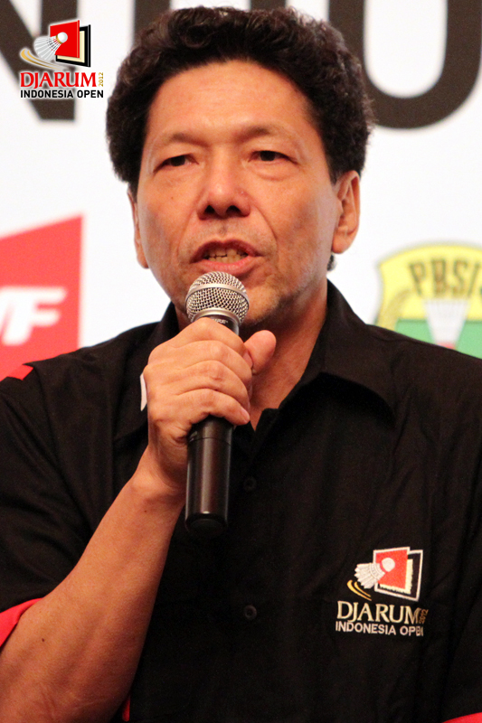 Kepala Sub bidang Pelatnas PB PBSI Christian Hadinata tengah mendengarkan pertanyaan dari para wartawan saat konfrensi pers Djarum Indonesia Open 2012 di Bali Room di Hotel Kempinski, Jakarta.