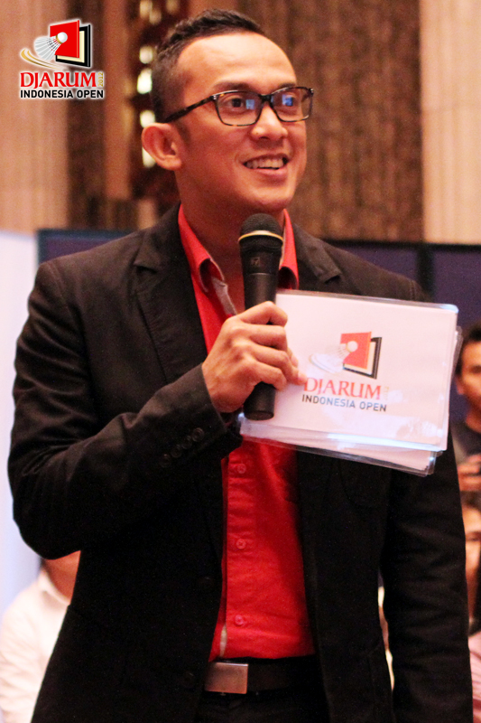 Perwakilan PT Djarum, Yan Haryadi tengah menjawab pertanyaan wartawan saat konfrensi pers Djarum Indonesia Open 2012 di Bali Room di Hotel Kempinski, Jakarta.