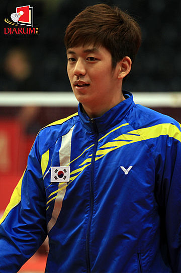 Lee Yong Dae bersiap melakukan pemanasan di Istora Senayan Jakarta.