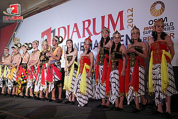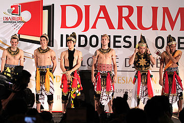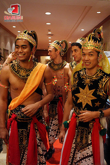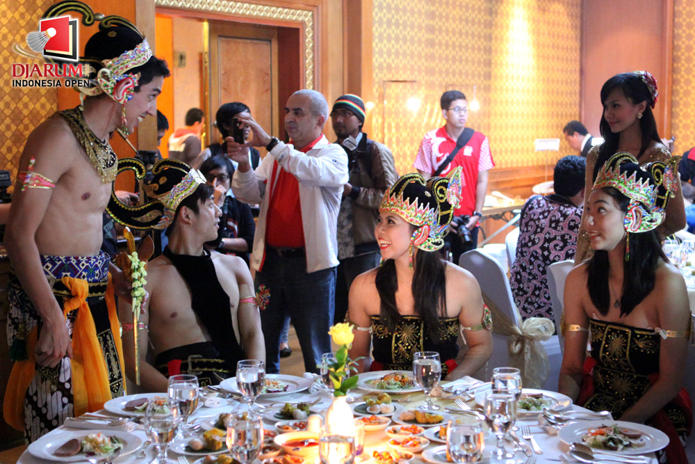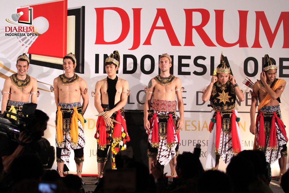 Beberapa pemain yang berlaga di Djarum Indonesia Open 2012 berpakaian seperti tokoh wayang ketika hadir di Welcome Dinner Djarum Indonesia Open 2012 di Hotel Sultan, Jakarta.