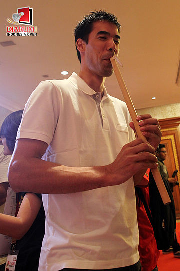 Salah seorang pemain asing mencoba menggunakan suling ketika menghadiri Welcome Dinner Djarum Indonesia Open 2012 di Hotel Sultan, Jakarta.